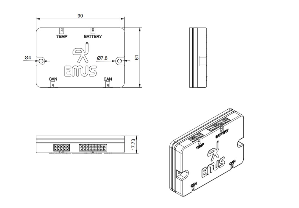 EMUS Centralized Cell Group Module (CCGM) is a battery cells communication adapter (or “Slave unit”) equipped with two CAN connectors for easy BMS system assembly and integrated proprietary EMUS software allows data transfer within 100ms frequency. It also have 5 external temperature sensors to monitor ambient temperature.