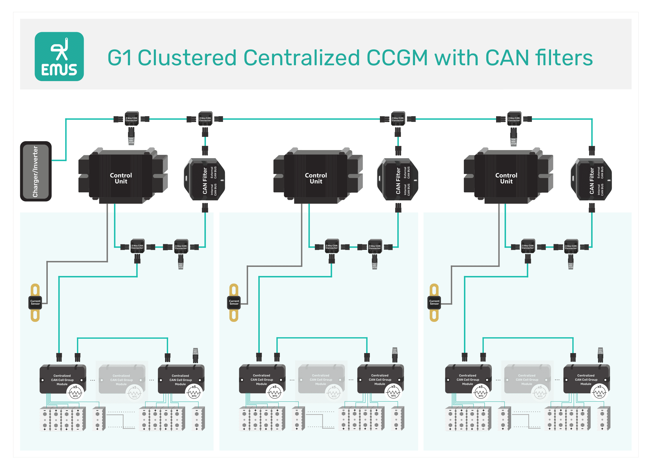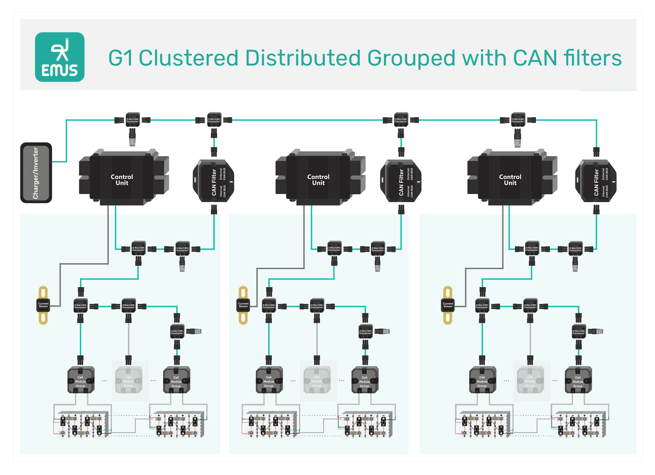 EMUS G1 Clustered BMS topology is used to build large Lithium-ion battery systems mostly in electric energy storage (EES) applications where high power, capacity, and modularity are required. Such BMS configuration not only allows to build large ESS system, but also provides redundancy features, for example, if one of the battery strings/subsystems runs out of operation, other battery strings can operate and provide power continuously. Up to 6MWh power energy storage systems can be built with off-the-shelf products and larger systems can be made with customized solutions.