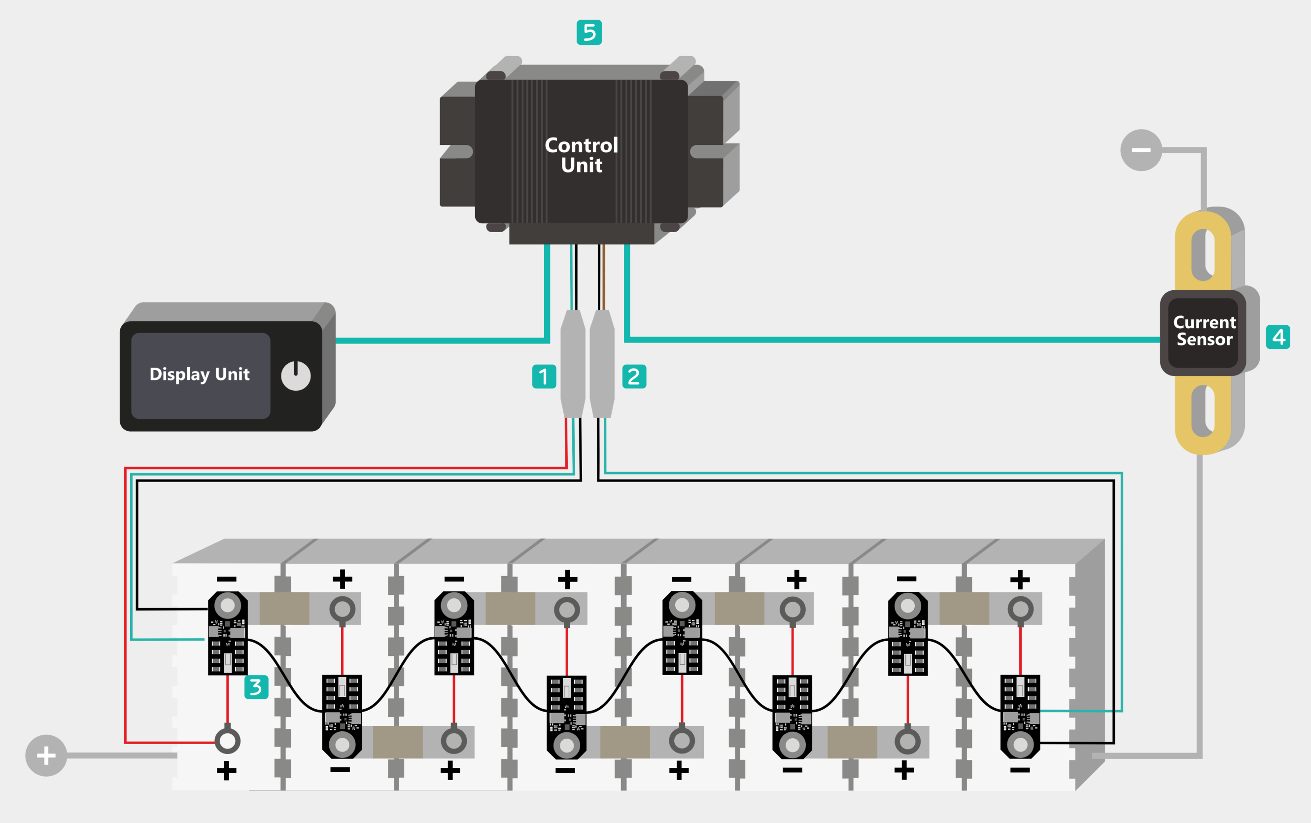 With such BMS system the whole battery pack is controlled by Control Unit which has interface to Cell Modules that are directly mounted on Lithium chemistry battery cells. Each Cell Module measures cell’s voltage and temperature and returns this information back to Control Unit via communication wire. The Cell Modules are interconnected with a single communication wire running from module to module. The first Cell Module (at the “–” terminal of the pack) and last Cell Module (at the “+” of the pack) are connected to Control Unit via optical Top/Bottom Isolators which perform data interface adaption and ensure Control Unit circuit isolation from high voltages of the battery pack.