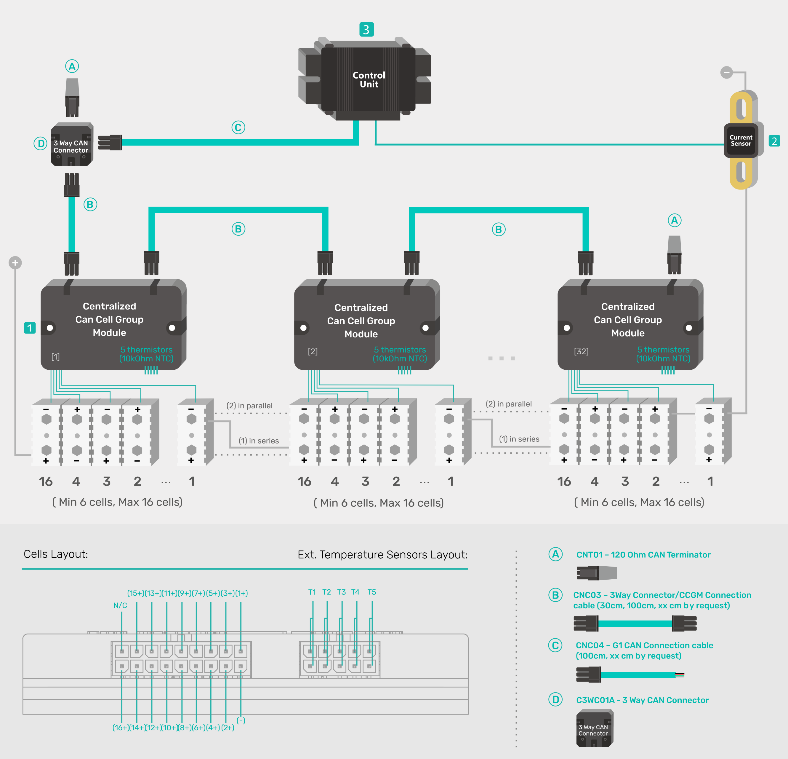 Each CCGM is capable to manage from 6 up to 16 lithium cells and total 32 CCGM units can be connected in series, parallel or mixed topology. Meaning with one Control Unit client is capable to monitor up to 512 cells battery pack.
